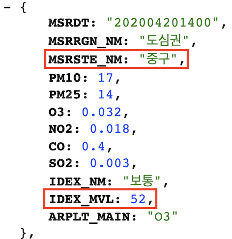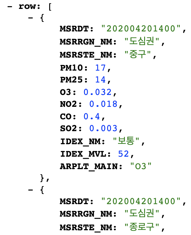 : RealtimeCityAir > row 에 미세먼지 데이터를 꺼내기