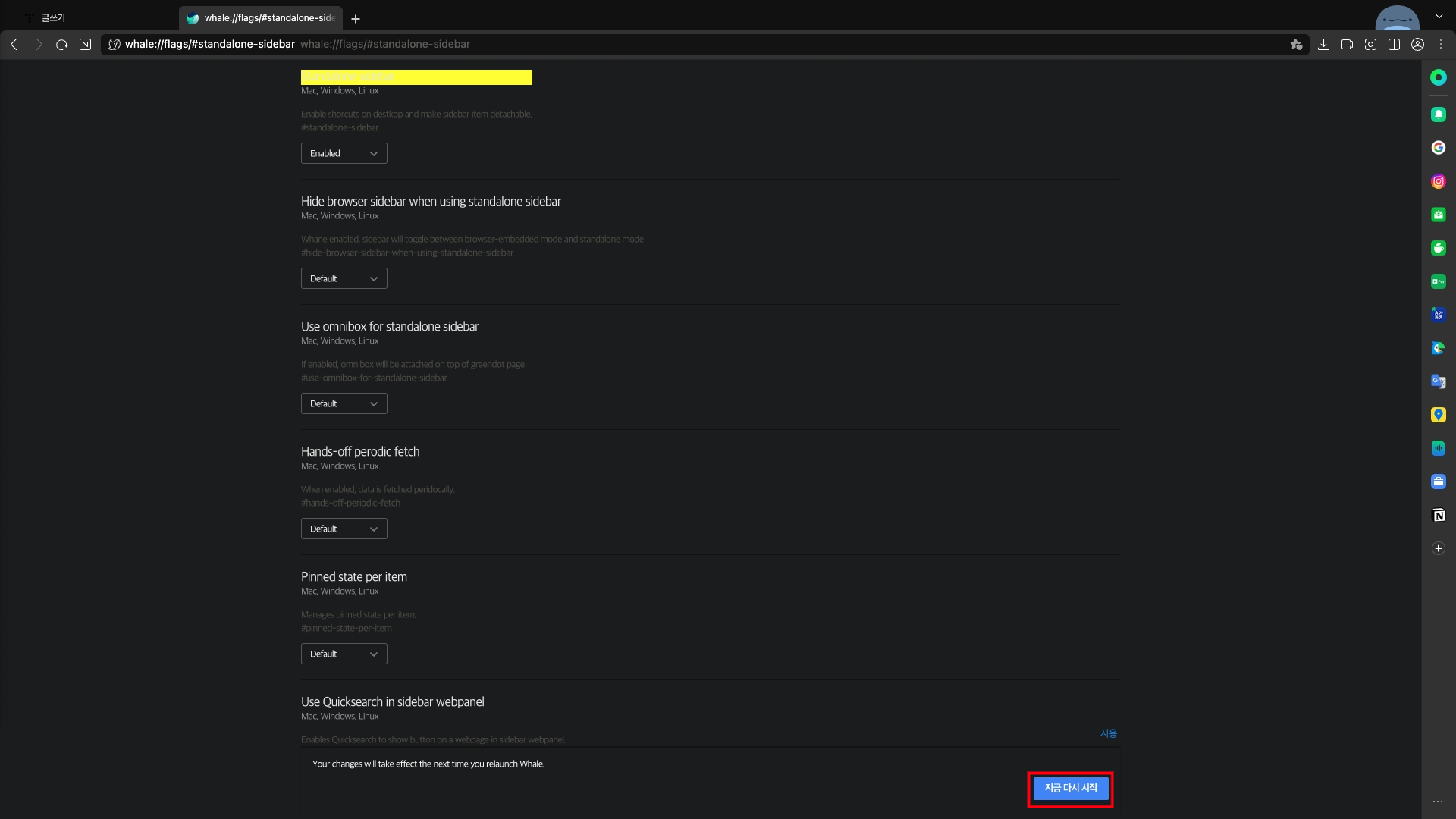 4. 바탕화면에서 오른쪽 웨일(Whale) 사이드바 사용 가능!