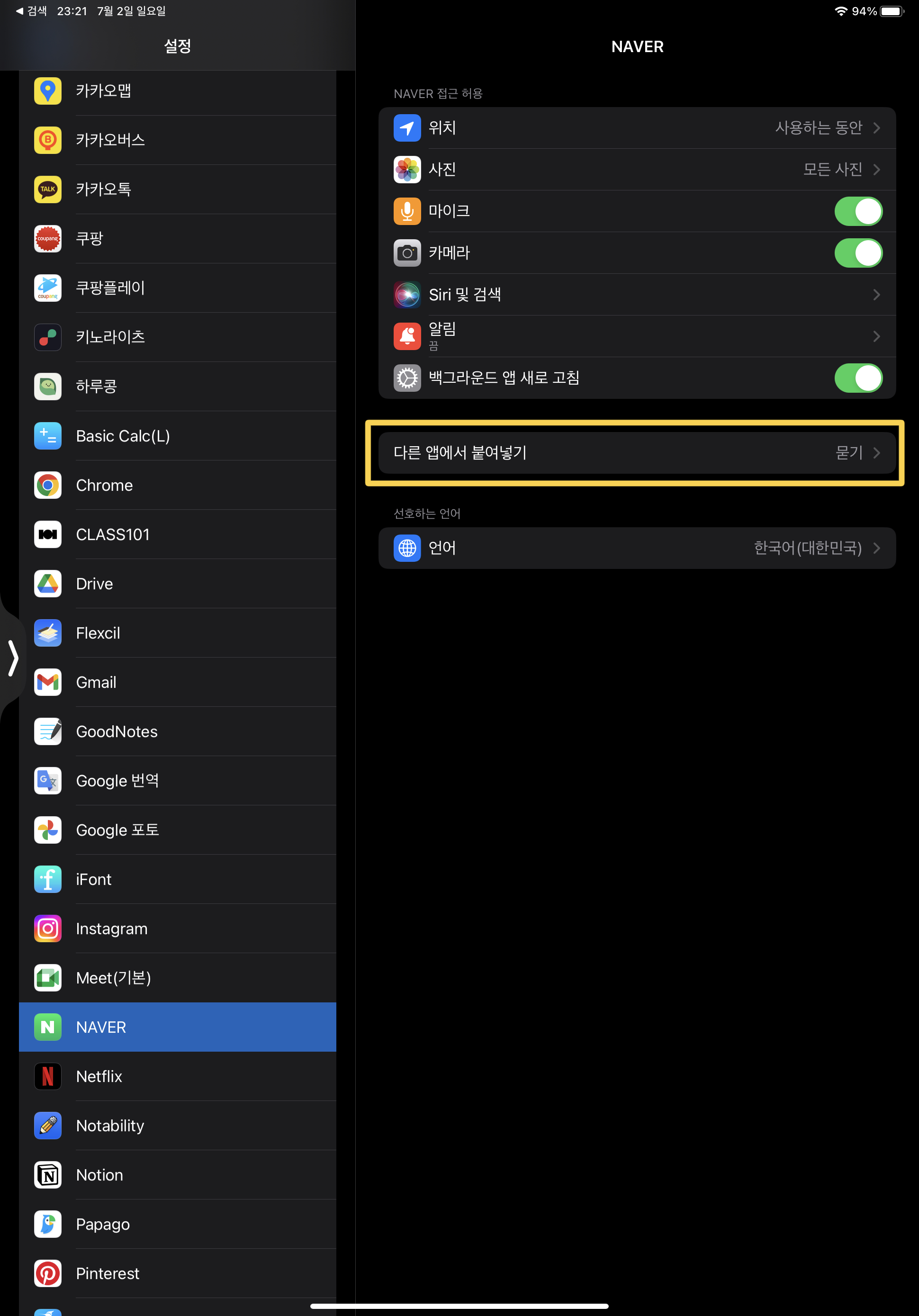 1. 설정 > 내가 쓰다가 빡친 앱 > 다른 앱에서 붙여넣기 선택 ('묻기'로 되어있을 거다)