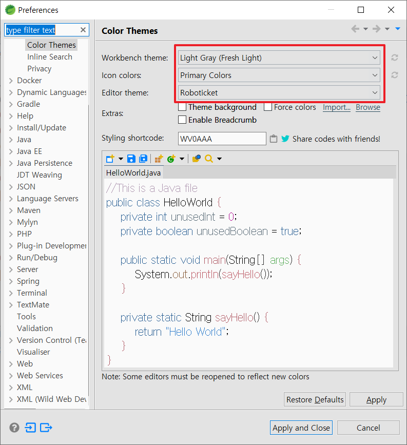 3. Window → Preferences → General → Appearance → Open Color Themes page 순으로 진행