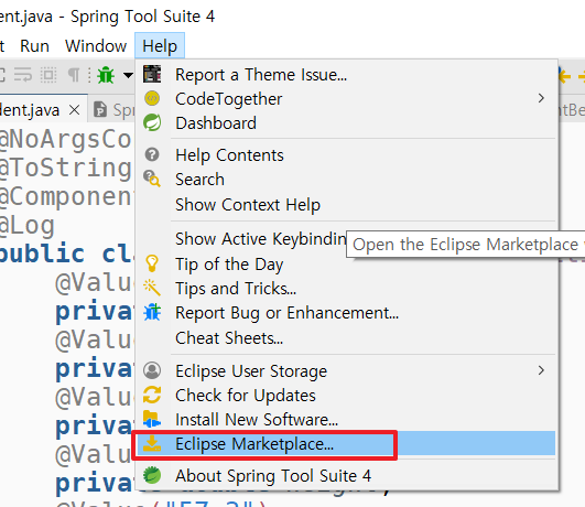 1. 이클립스 상단 메뉴 Help → Eclipse Marketplace → search에 테마 검색